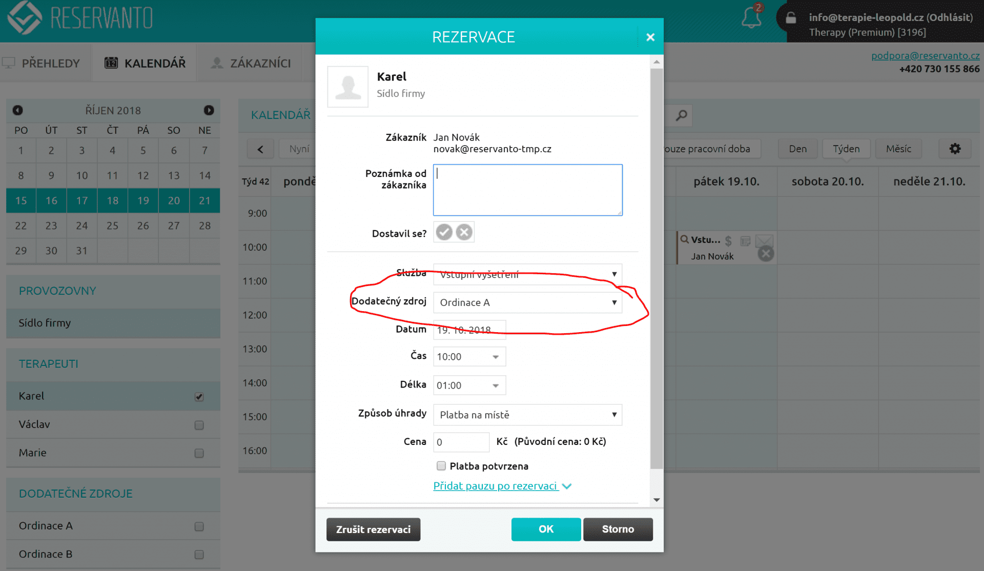 Dodatečný zdroj je zdroj, který vaši zákazníci neuvidí, ale potřebujete jej také rezervovat. Typickým použitím je situace, kdy máte např. 3 terapeuty a 2 ordinace. Pokud budou dva terapeuti v daný čas vytíženi, třetí už nemůže být rezervován, protože už nemá kde zákazníka obsloužit. Zákazník si tedy vybírá svého terapeuta, ordinace se zvolí automaticky bez vědomí zákazníka.