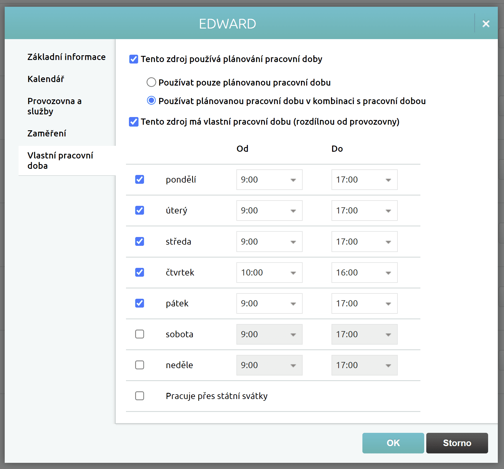 Zvolíte u něj „Tento zdroj používá plánování pracovní doby“ + „Používat plánovanou pracovní dobu v kombinaci s pracovní dobou“ + „Tento zdroj má vlastní pracovní dobu (rozdílnou od provozovny)“.