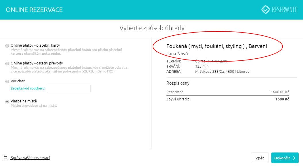 Na stránce s výběrem úhrady zákazník vidí vypsané všechny zvolené služby. Při rezervaci více služeb najednou jen není možné využít permanentky.