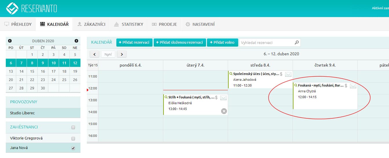 Obsluha rezervačního systému pozná “složenou rezervaci” v kalendáři podle vypsaných služeb.
