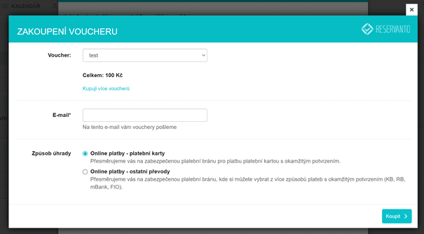 Máte-li povolené Online platby a prodejní formulář vložený na webu, mohou zákazníci nakupovat vaše vouchery. Stačí jim k tomu výběr voucheru, zadání e-mailové adresy a výběr způsobu úhrady. V dalším kroku dojde k přesměrování na platební bránu a po úspěšném dokončení platby odešle systém zákazníkovi potvrzovací e-mail se zakoupenými vouchery.