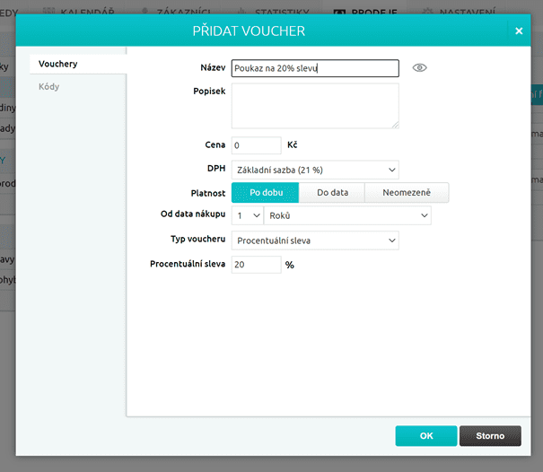 V části Prodeje / Vouchery vytvořte vouchery, které budete nabízet zákazníkům. Např. „Poukaz na 20% slevu“.