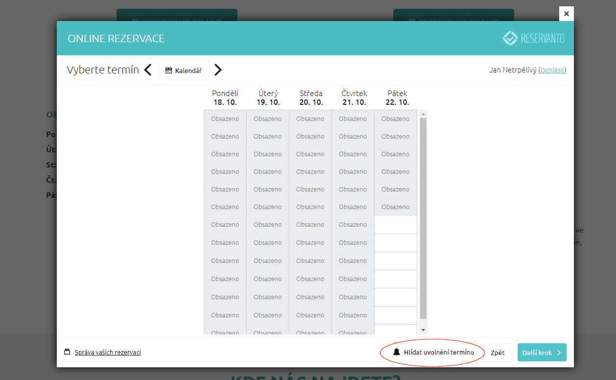 Systém bude hlídat uvolnění dostatečně velkého časového bloku u zvoleného zdroje (či více zdrojů v případě vybrané funkce „Je mi to jedno“). Jakmile se díky stornování rezervace nebo smazání volna uvolní časový blok, do kterého se vejde zákazníkem vybraná služba, odešle systém zákazníkovi zprávu (dle nastavení e-mail či SMS).